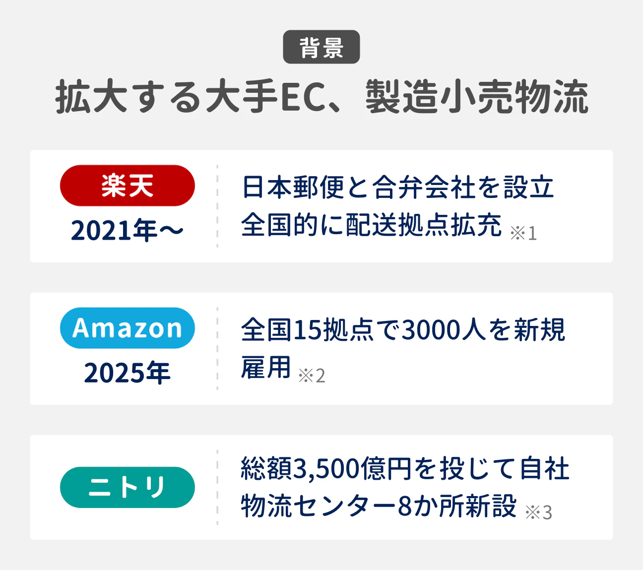 コロナ禍の巣ごもり需要を契機にECの発注数は伸長。大手ECや製造小売形態をとるメーカーでは自社物流への投資を拡大し、輸送コストの最適化を模索しています。国内の大型物流拠点数は増大し、求人も増加傾向です。
