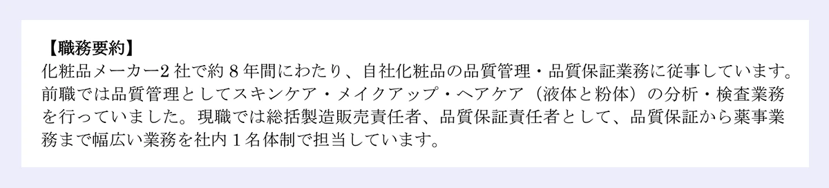 職務要約では「経験社数」と「年数」「業務範囲(品質管理/品質保証/薬事)」の3つがわかるように明記しながら、これから記す職務経歴を簡単に要約します。