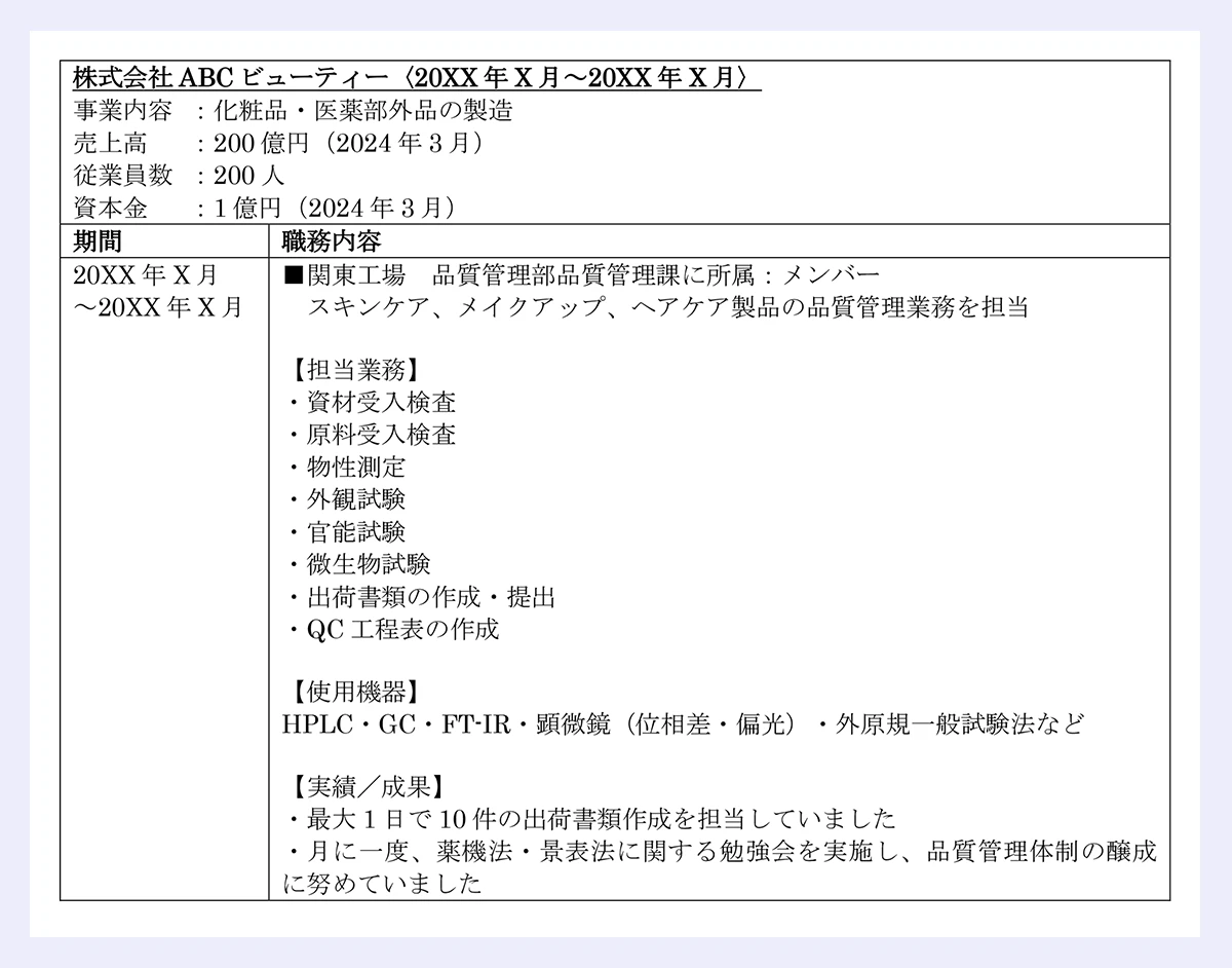 品質管理は「自社化粧品のスキンケアライン(化粧品、乳液)の品質管理業務」など、カテゴリや剤型などがわかる形で記載しましょう。剤型によって分析方法が異なるため、商品を詳細まで書き出すことでいろんな製品に対応できることが伝わります。