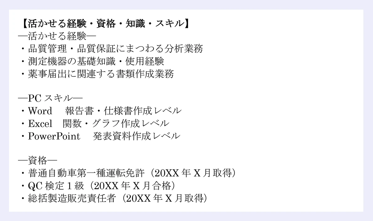 加えて、取り扱った経験のある「製品の種類」はしっかりと示したいところ。例えば液体と粉体とでは品質管理の方法も内容も大きく異なるため、採用基準との整合性が大切になるからです。「スキンケア(液体、クリーム)」「ヘアケア(スプレー、カラー)」など、担当製品のカテゴリや剤型を【職務内容】で触れてください。
