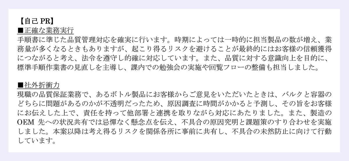 企業が求めるのは、受け身でトラブルを収めてくれるだけではなく、問題そのものが起きないようにしてくれる「攻め」の品質保証。主体的に行動した経験を伝えられれば、「自社でも能動的に業務にあたってくれそう」という好印象につながります。