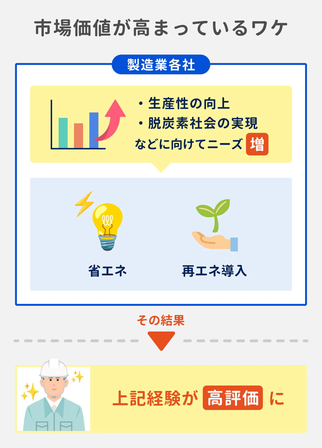 - 生産性の向上や脱炭素社会の実現に向け、既存設備の省エネルギー化や、再エネの導入に取り組む企業も増えており、そうした知見のある人材の市場価値も高まってきている。