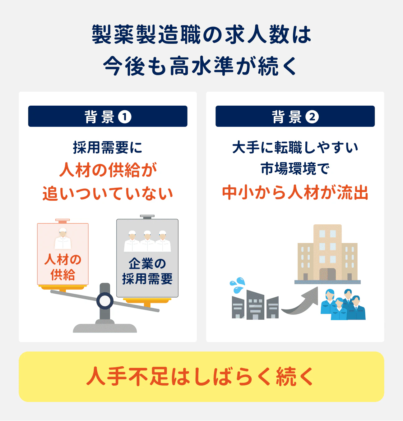 製薬企業やCMO/CDMOで製造人材へのニーズが高い水準にある一方、労働人口が減少していることもあって人材の需要と供給に大きなギャップが生じています。