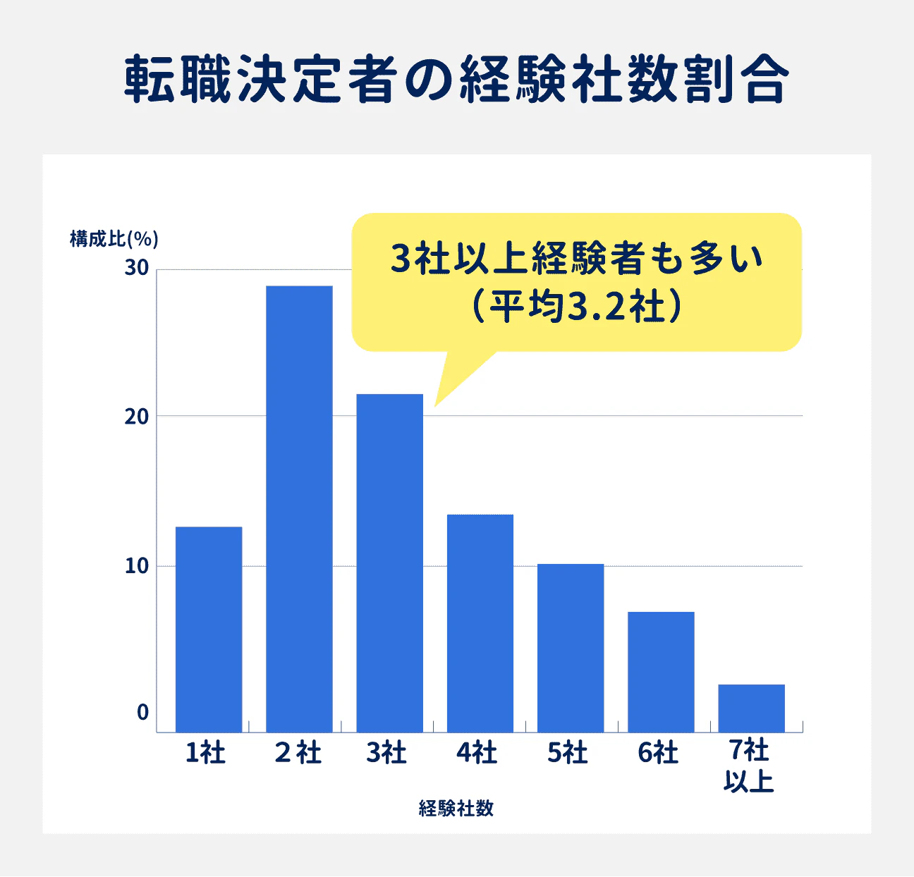 転職が決まった希望者の経験社数は平均3.21社でやや高い割合です。多くの場合、社数の多さ自体がネガティブに捉えられることはありませんが、1社2年以内に転職しているケースがある場合は「長く働けないのかな」と捉えられる可能性があります。